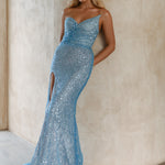 Step into effortless glamour with our Amos Formal Dress, lined in nude to highlight its intricate detail. The fitted silhouette is enhanced by a striking asymmetric strapless neckline, offering a modern edge to a classic design. A daring high-leg split at the front adds movement and allure, while the invisible back zip ensures a flawless finish. Perfect for evening events, galas, and red-carpet moments.