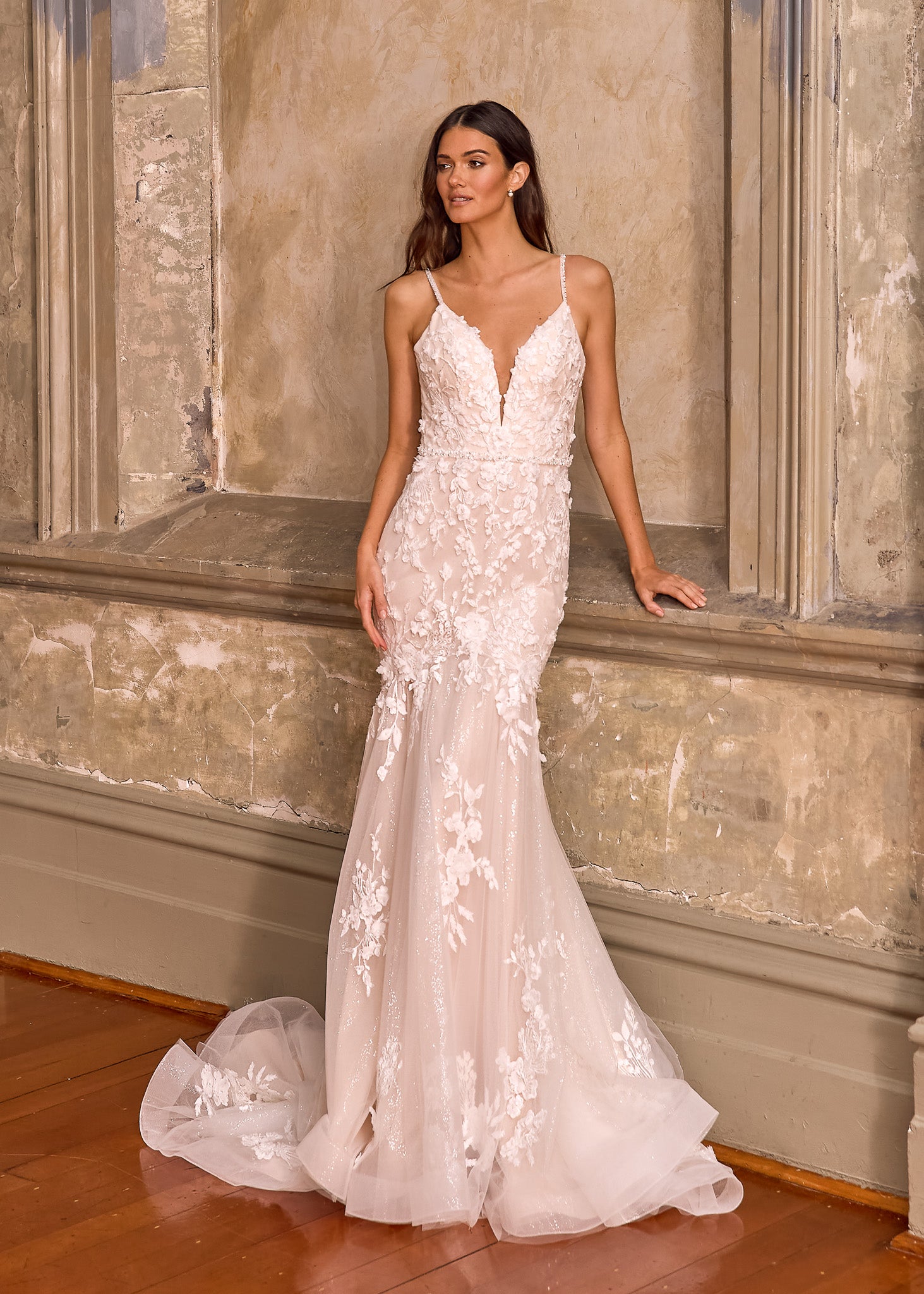 The Asteria wedding dress is an effortlessly elegant, fitted mermaid silhouette. Asteria’s bodice features a deep sweetheart plunge neckline with beaded spaghetti straps. The 3D lace applique is adorned with pearls and cascades to a flared tulle mermaid skirt. The back flaunts a deep v and chapel length train.