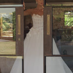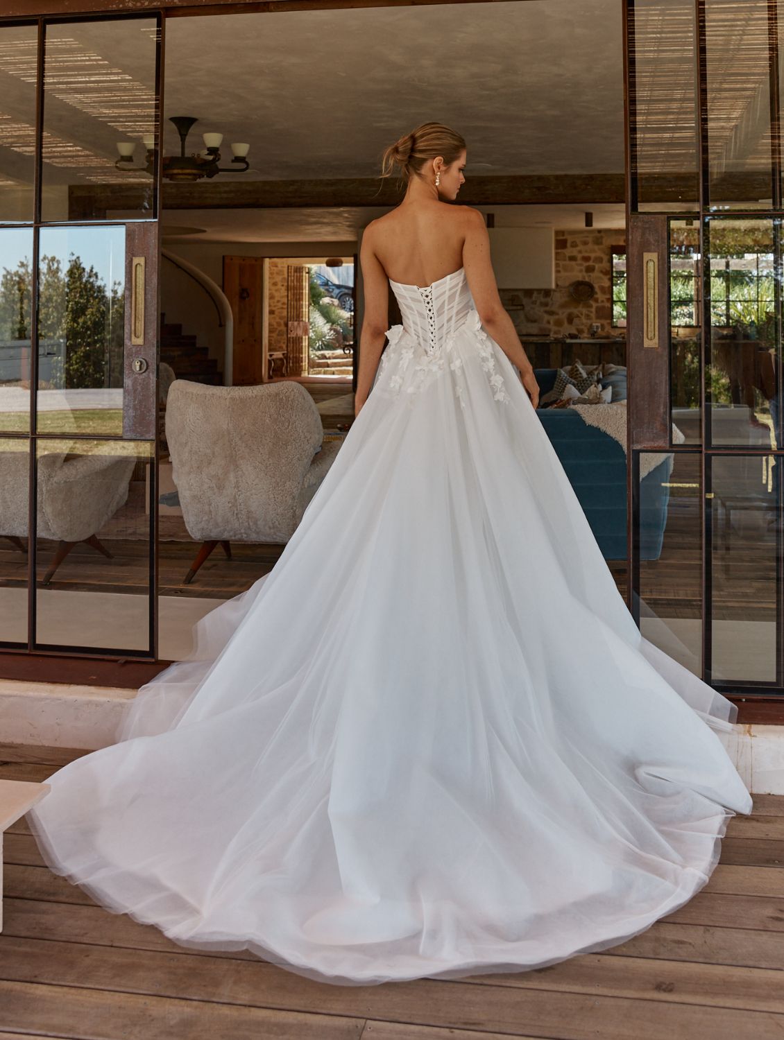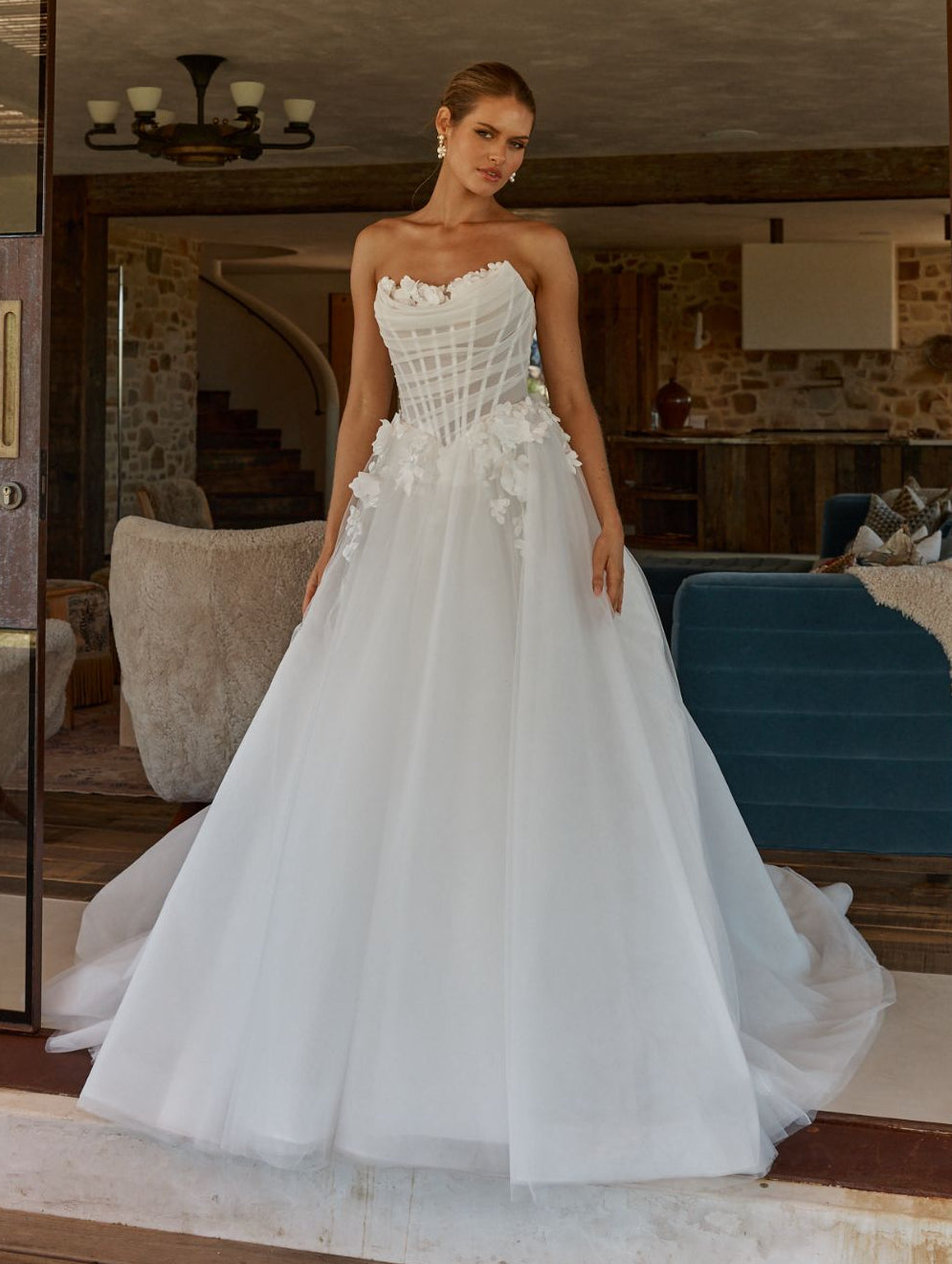 The Barbara wedding dress is a georgette ball gown with an illusion basque waist bodice, featuring exposed boning and naturally draped pleating across the bodice. Laser-cut 3D floral appliqué adorns the top of the bust cups and gently trails from the waist into a voluminous skirt. The cathedral-length skirt is layered with tulle and georgette for a soft, dreamy finish.