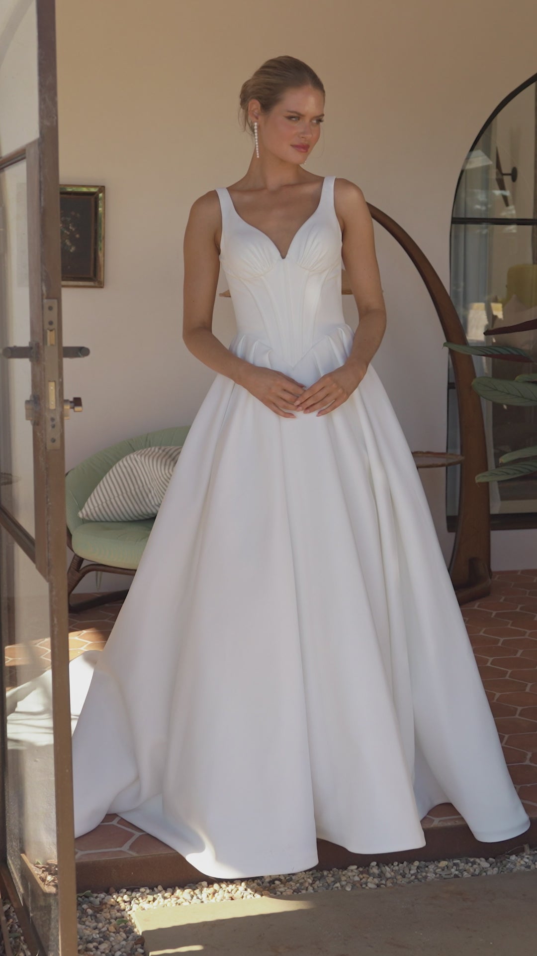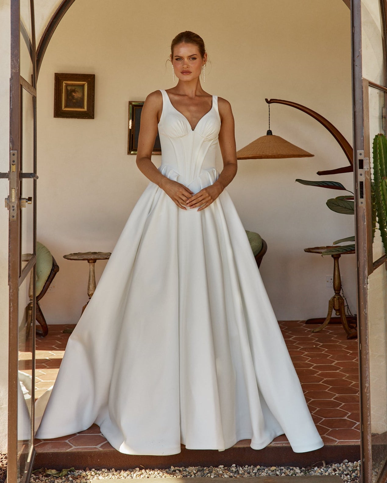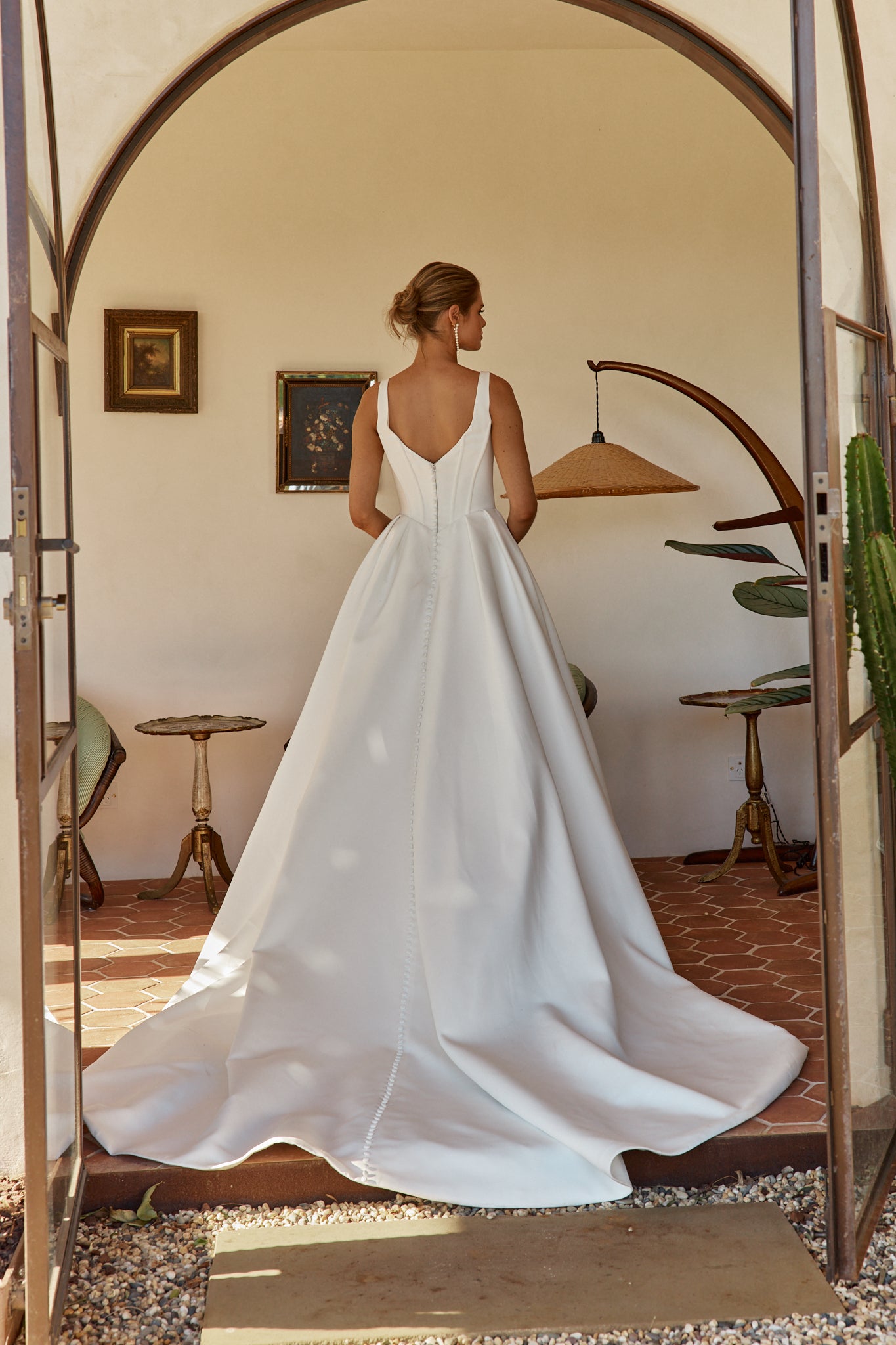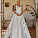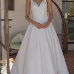 The Bec wedding dress is a timeless satin gown featuring a V-neckline with one-inch straps and softly gathered detailing across the bust. The structured bodice is fitted with boning and finishes in a flattering basque waistline. From there, the full pleated skirt flows into a cathedral-length train, finished with loop-and-button detailing that trails to the hem.