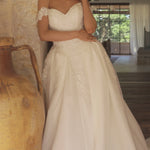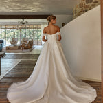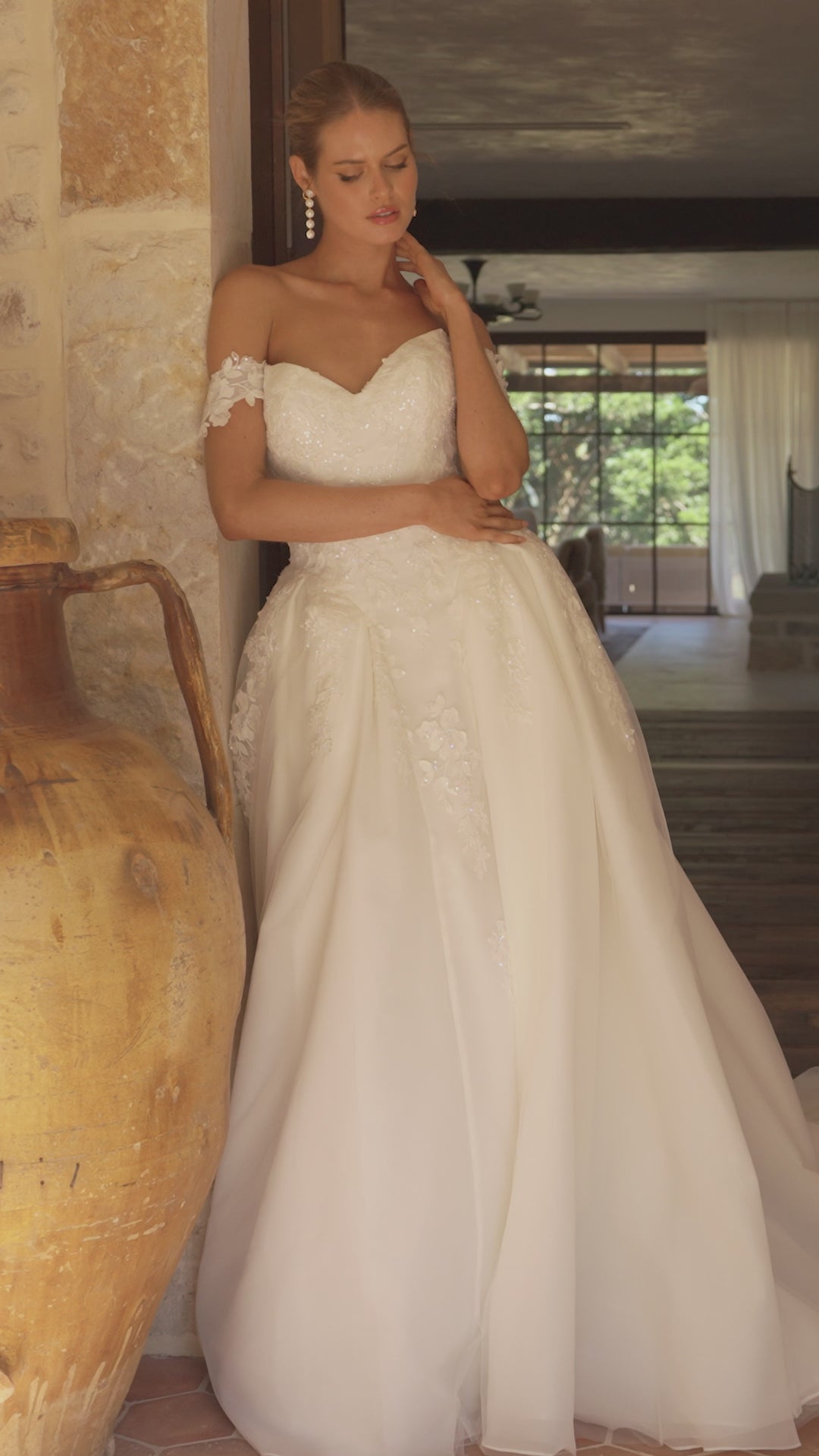 The Belamy wedding dress is a romantic ball gown featuring a deep sweetheart neckline and a basque waist, with the center front panel extending elegantly though the skirt. Beaded lace appliqué adorns the bodice and softly trails into the top of the skirt. The back mirrors the front with a panel flowing into the skirt, finished with loop-and-button detailing from top to hem. Delicate detachable illusion off-the-shoulder straps complete the look.