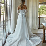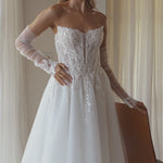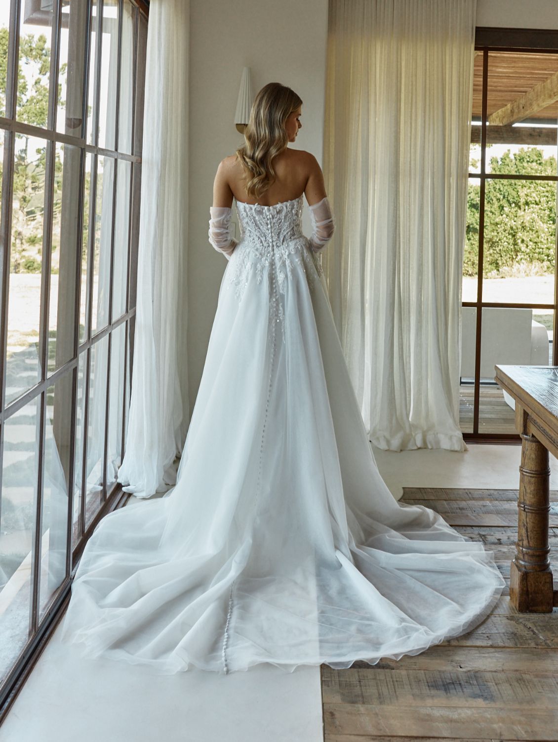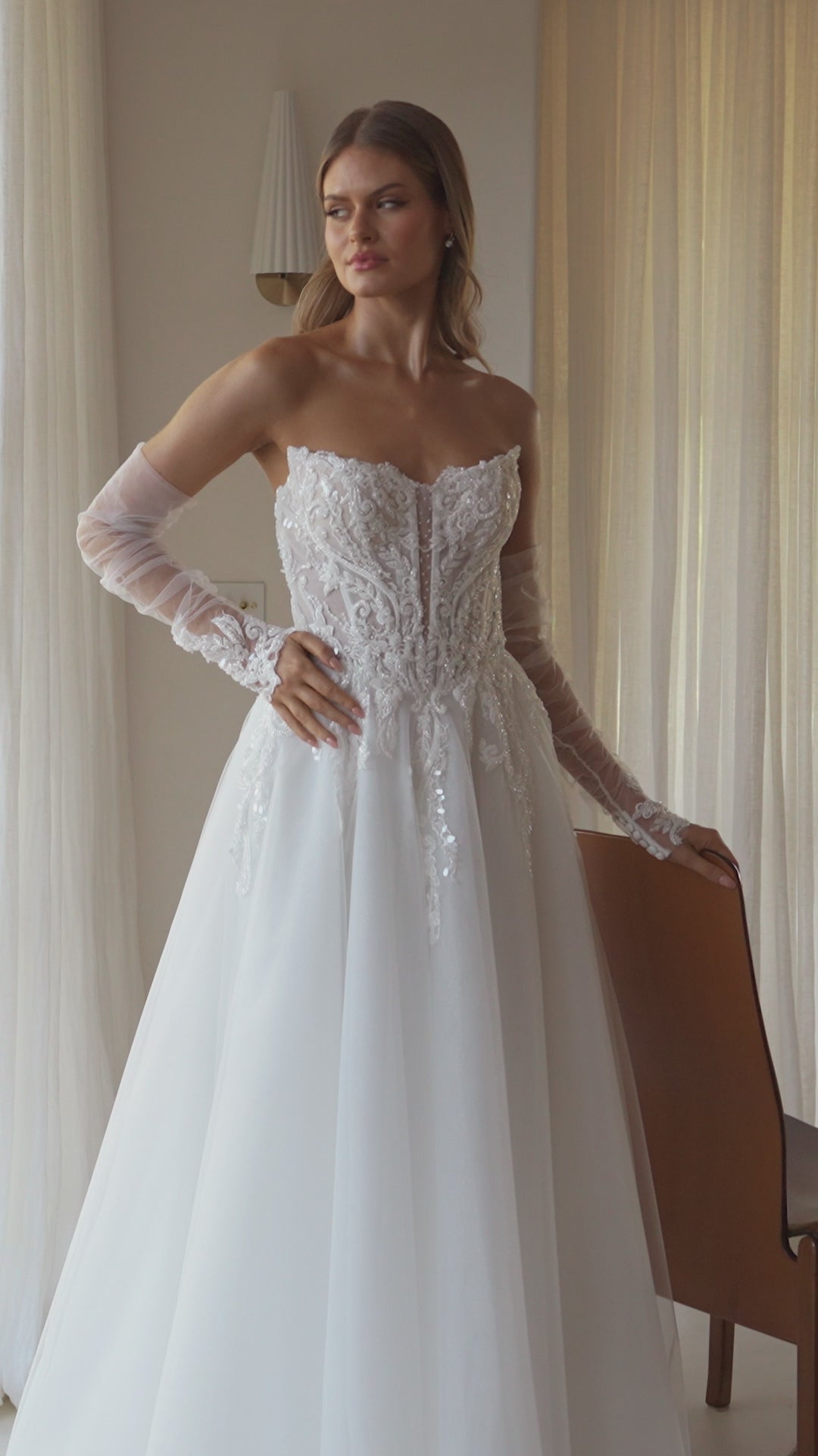 The Billie wedding dress is an elegant A-line gown featuring a strapless bodice adorned with baroque beaded lace appliqué and peaked busts. A plunging V-center front with a mesh insert adds a modern touch, while the basque waist defines the silhouette and lace appliqué trails softly into the skirt. Layers of tulle create a flowing skirt, finished with a cathedral-length train and loop-and-button detailing from bodice to hem. Detachable tulle long sleeves with beaded appliqué allow for a customizable look.