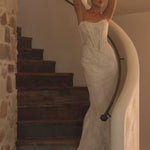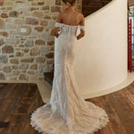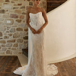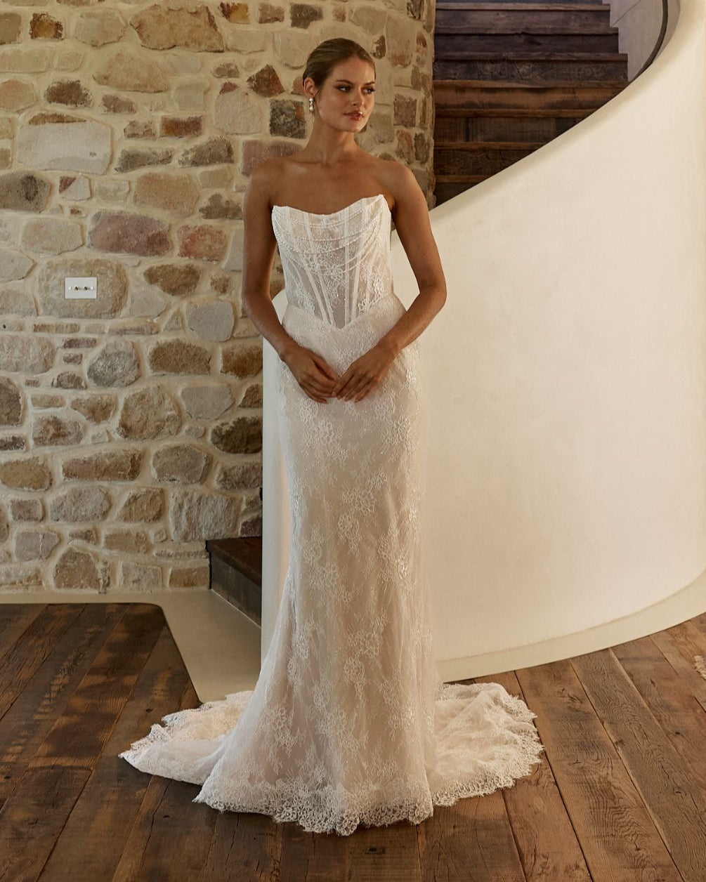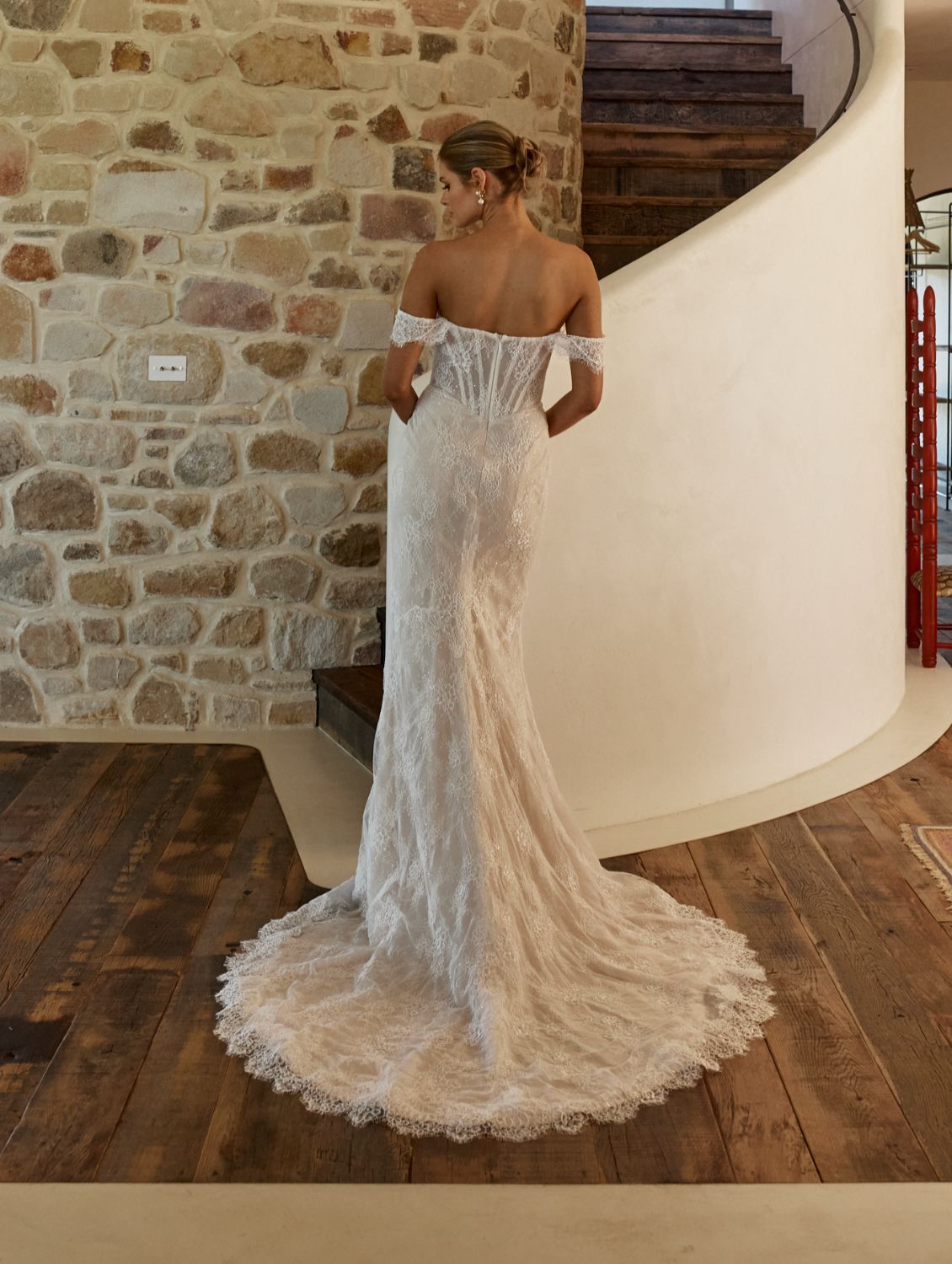 The Blair wedding dress is a light and slinky fit-and-flare gown crafted from delicate Chantilly lace. The illusion bodice features a basque waist, boning, and a soft sweetheart neckline adorned with strings of pearls. Off-the-shoulder straps showcase Chantilly lace with eyelash trim, adding an elegant and romantic finish.