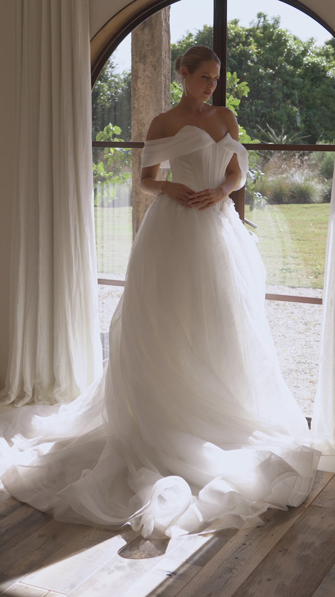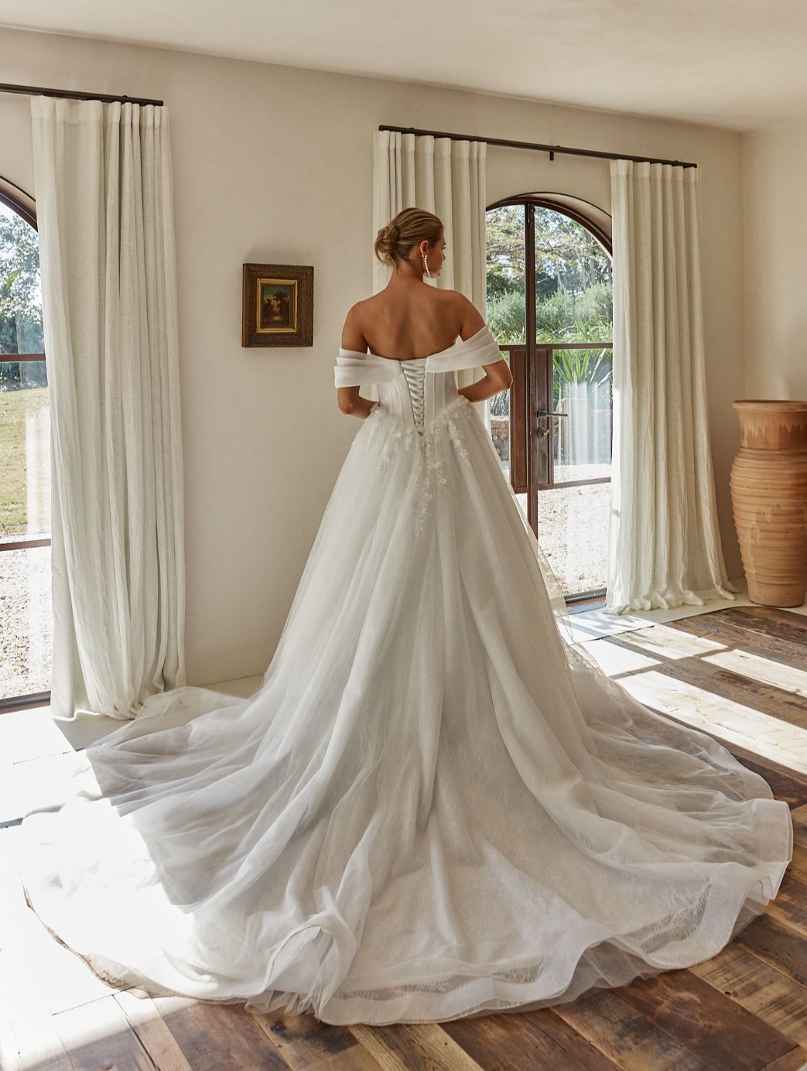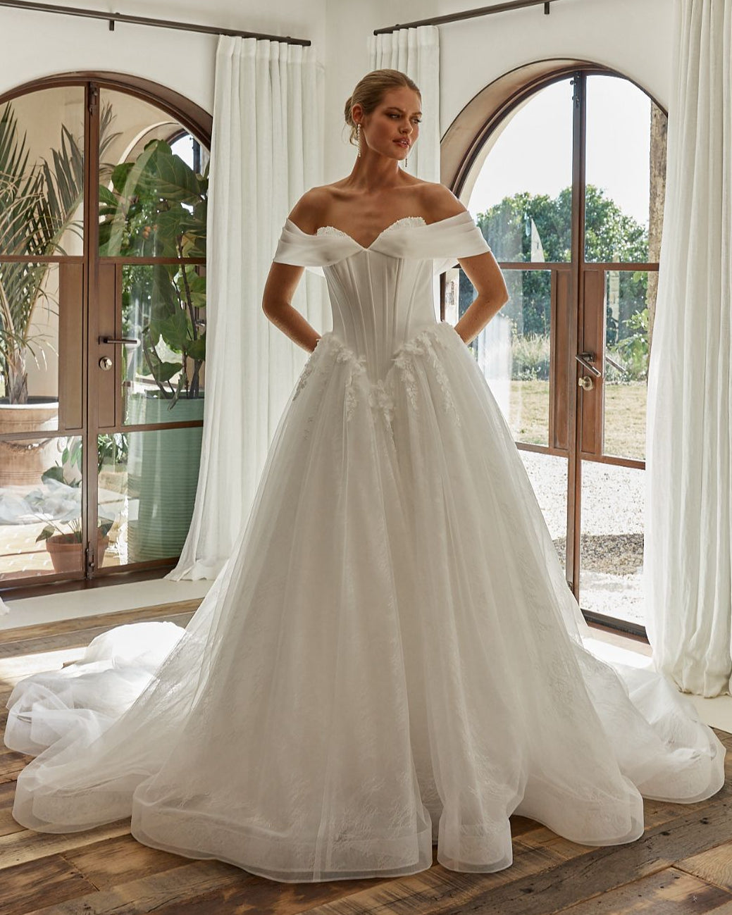 The Bronte wedding dress is a show-stopping ball gown with a structured boned corset bodice. Off-the-shoulder pleated organza straps frame pearl peekaboo bust cups, while the deep basque waistline defines the silhouette. The bodice is crafted from luxurious satin, and the voluminous ball gown skirt is made from layers of lace and tulle, featuring 3D floral lace appliqué at the hips for added dimension and texture.