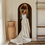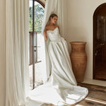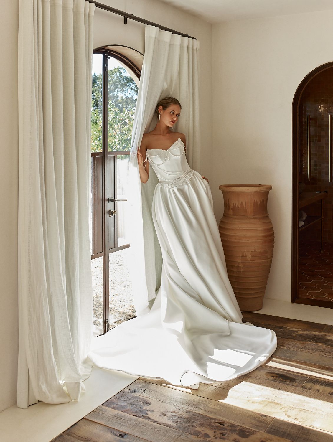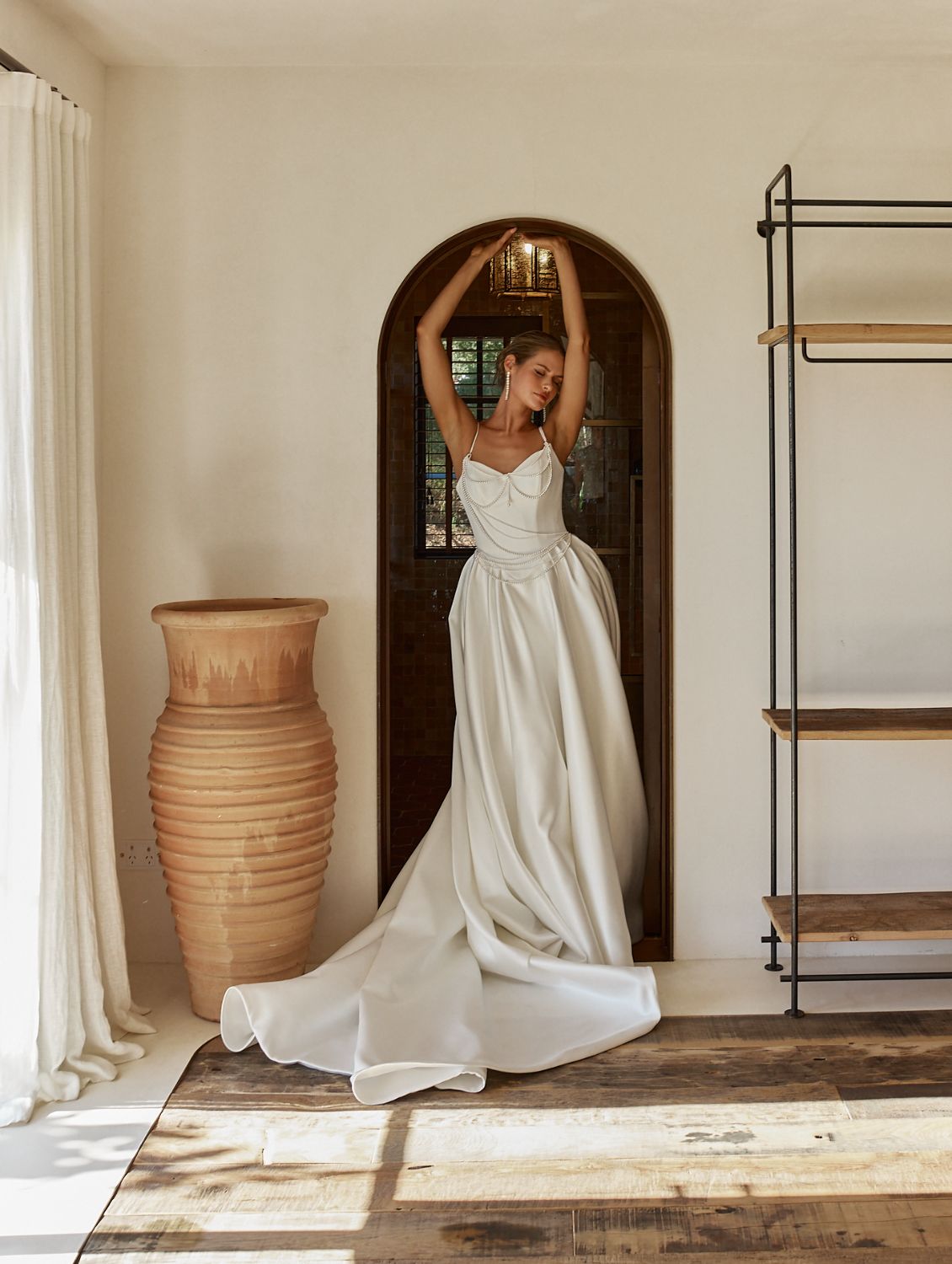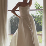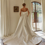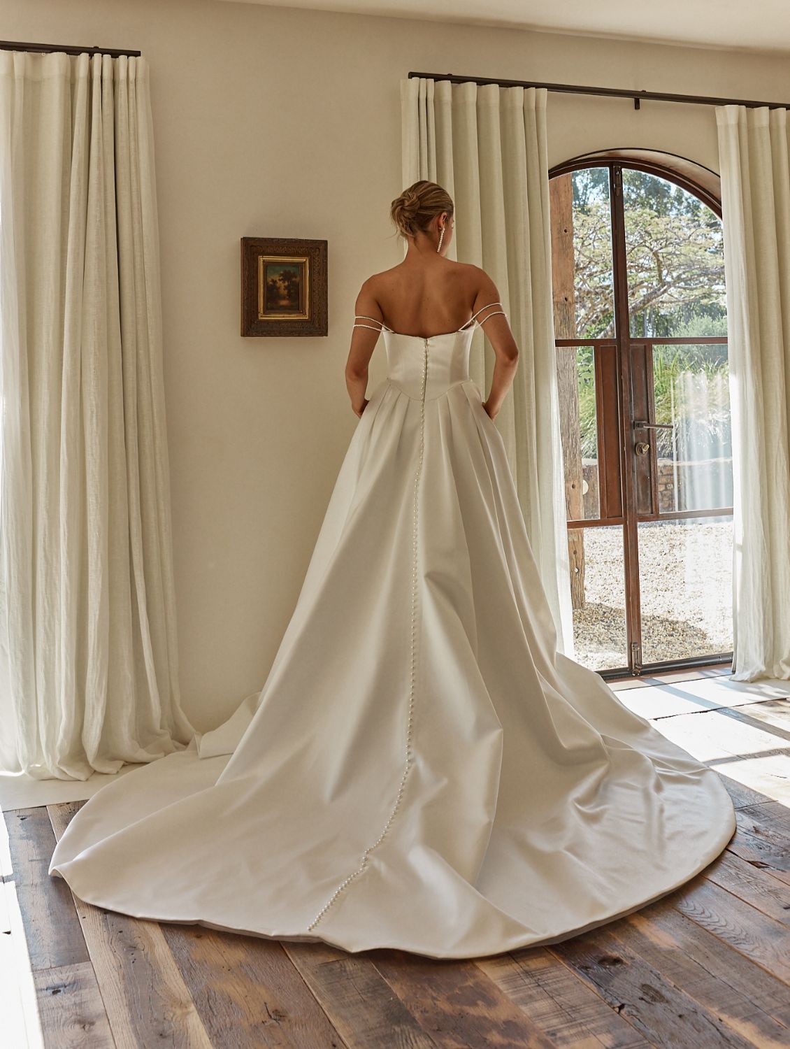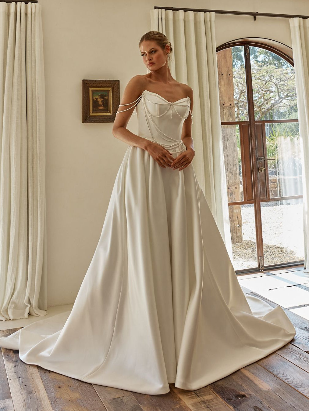 The Brynn wedding dress is a Mikado ball gown with a rounded basque waistline and peaked bust cups adorned with strings of pearls. Off-the-shoulder pearl straps frame the shoulders, adding an elegant touch. The structured skirt features pleating at the hips and extends into the back, flowing into a cathedral-length train. The back is finished with a concealed invisible zipper and decorative pearl buttons that trail from the bodice to the hem.