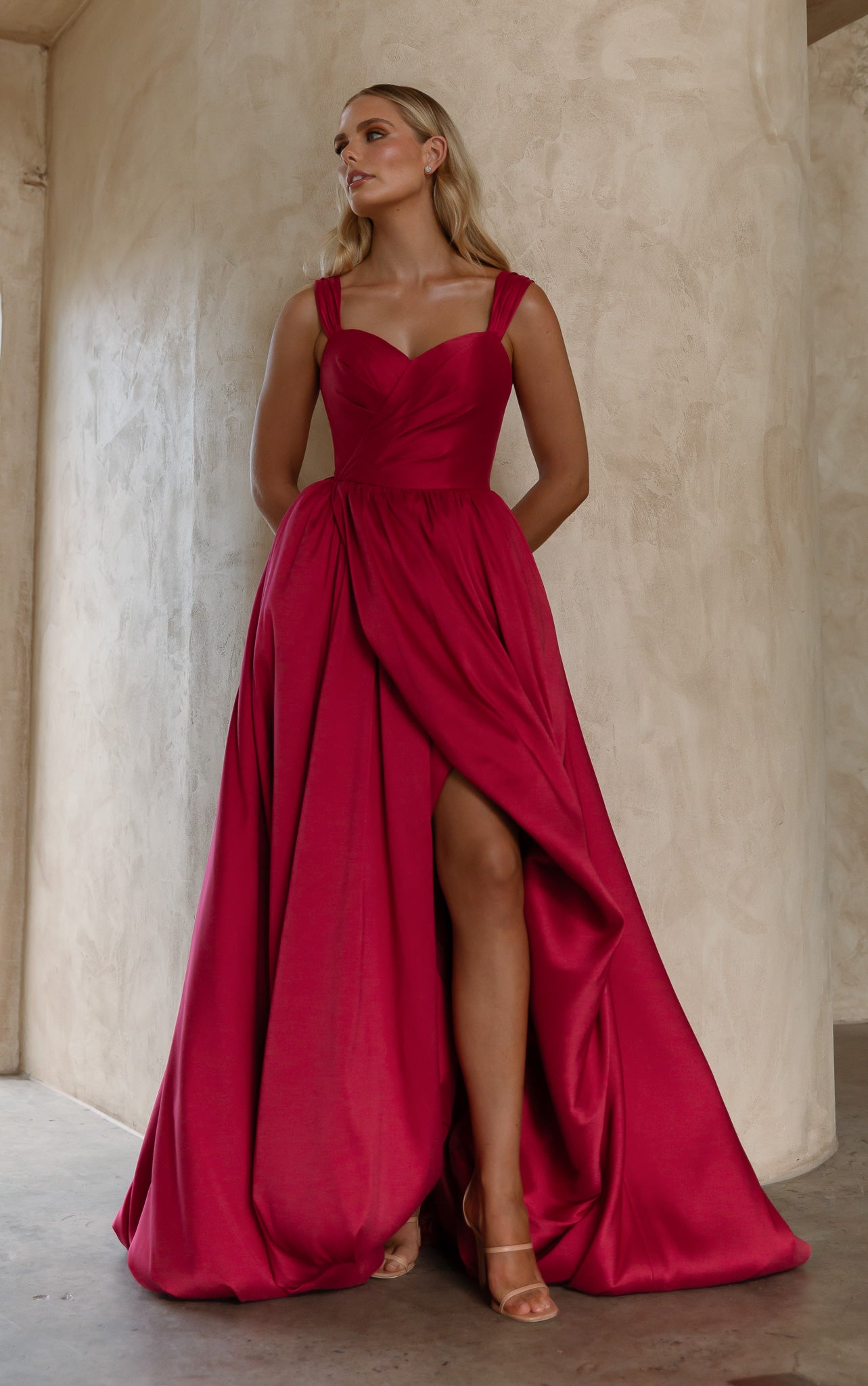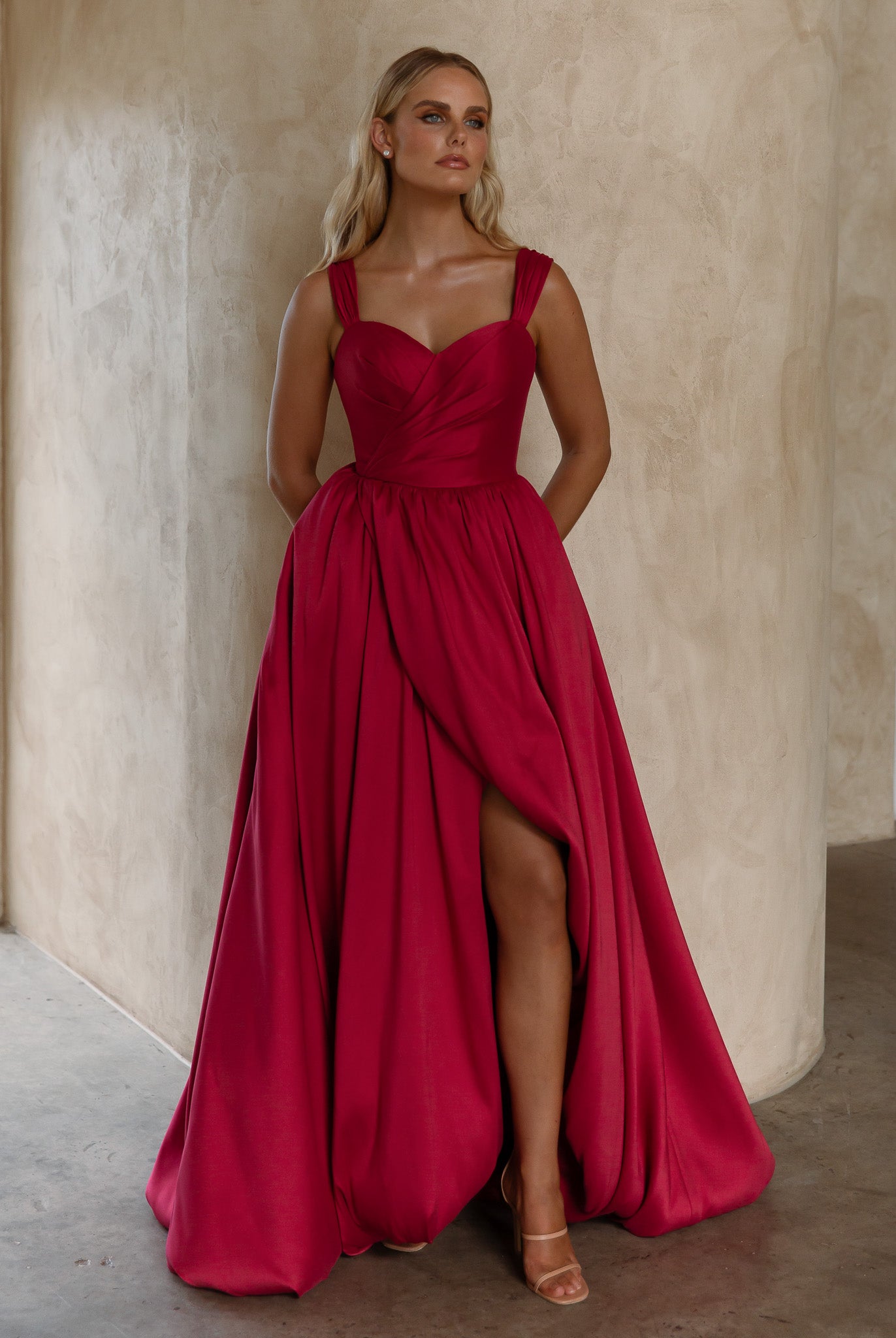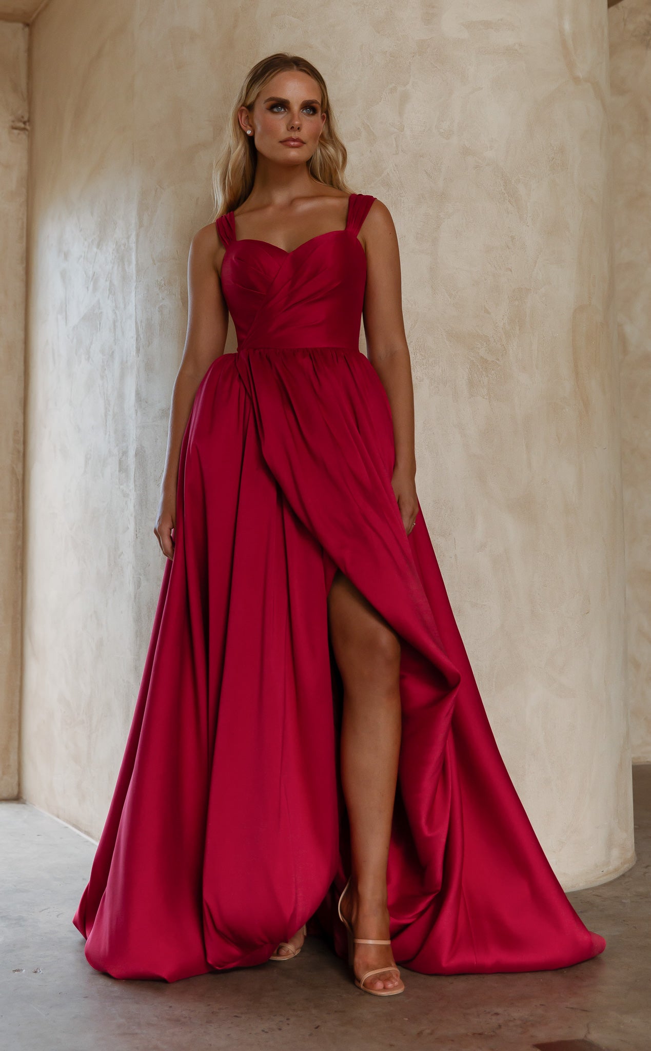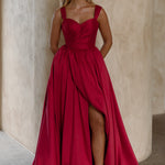Exuding timeless elegance, our Lyla Formal Dress is crafted from sumptuous brushed Mikado that gives structure and a subtle sheen. The sweetheart neckline and wide, supportive straps create a graceful, feminine silhouette while ensuring comfort. Flowing into a voluminous A-line skirt, the design is elevated by a daring front split that adds movement and a touch of modern allure. Finished with a sleek zip closure at the back, this gown is the perfect balance of romance and refined sophistication.