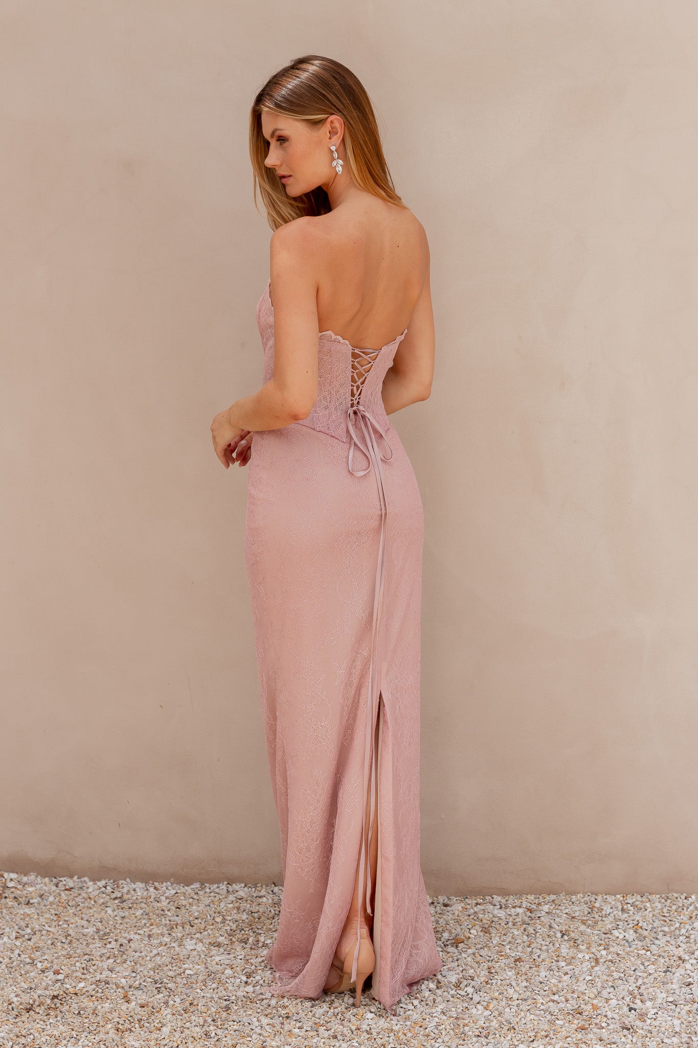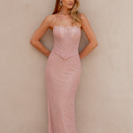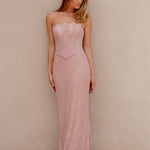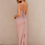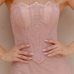 Sophisticated and alluring, our Mada Formal Dress is crafted from soft lace layered over jersey knit, offering both comfort and a figure-hugging fit. The illusion corset bodice with structured boning highlights the waist while showcasing intricate lace detailing for a touch of romance. An invisible back zip with lace-up feature ensures a secure, adjustable fit, while the back split allows for graceful movement. Designed to flatter from every angle, this gown perfectly balances modern elegance with timeless charm.