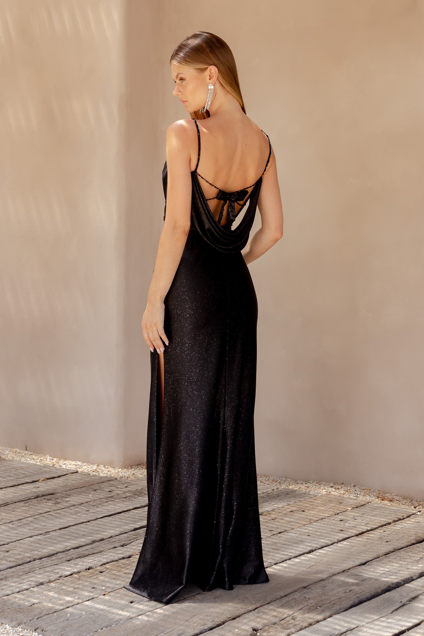 Turn heads in our glamorous Mavi Formal Dress, crafted from sparkle stretch satin jersey knit that skims the figure in a sleek, fitted silhouette. The cowl neckline at the front and back is paired with delicate beaded spaghetti straps, adding an elegant touch of shimmer. A daring high-leg split brings modern allure, while the beaded bow detail across the back creates a striking, romantic finish. Completed with an invisible zip closure, this gown blends sophistication and contemporary glamour for any unforgettable occasion.