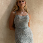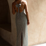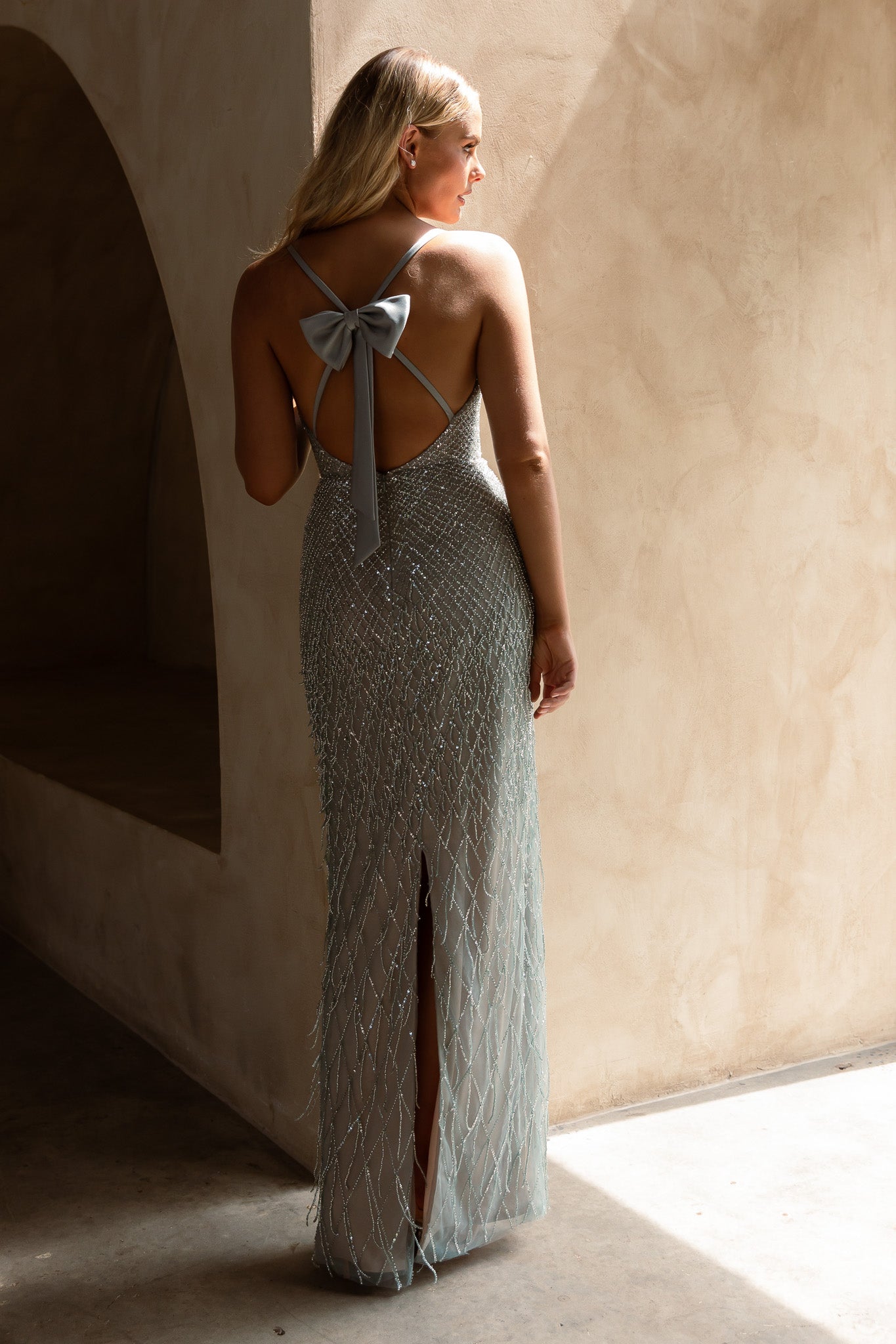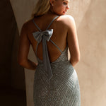Shimmering with elegance, our Pandora Formal Dress is crafted from beaded tulle over stretch knit, designed to contour the body in a sleek, fitted silhouette. The V-neckline with delicate spaghetti straps flows into a striking cross-over back finished with a bow detail, adding a touch of romance to its modern design. A low back with invisible zip ensures a seamless fit, while the back split allows for ease of movement without compromising sophistication. Perfect for making a graceful statement at any special occasion.
