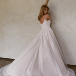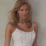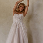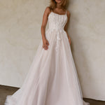 The Solange wedding dress features a timeless A-line silhouette with a soft scooped neckline. The lined bodice showcases exposed boning, adorned with carefully placed lace applique, and delicate spaghetti straps that connect to a soft v-back. The lace appliques elegantly connect the bodice to the skirt, creating a soft cascade through to the hips. The skirt is crafted with layered plain and glitter tulle, providing ethereal volume that flows into a court-length train.