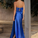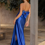 Designed to captivate, our Tovah Formal Dress is cut from luminous sparkle stretch satin jersey knit that glides over the body with a flawless, figure-hugging fit. The strapless neckline frames the décolletage with radiant allure, while elegant draping across the bodice enhances the silhouette. A daring high-leg split adds modern drama to the sleek, fitted skirt, perfectly balanced by the bow detail at the back for a touch of romance and charm. Finished with an invisible zip closure, this gown embodies sophistication with a glamorous edge.
