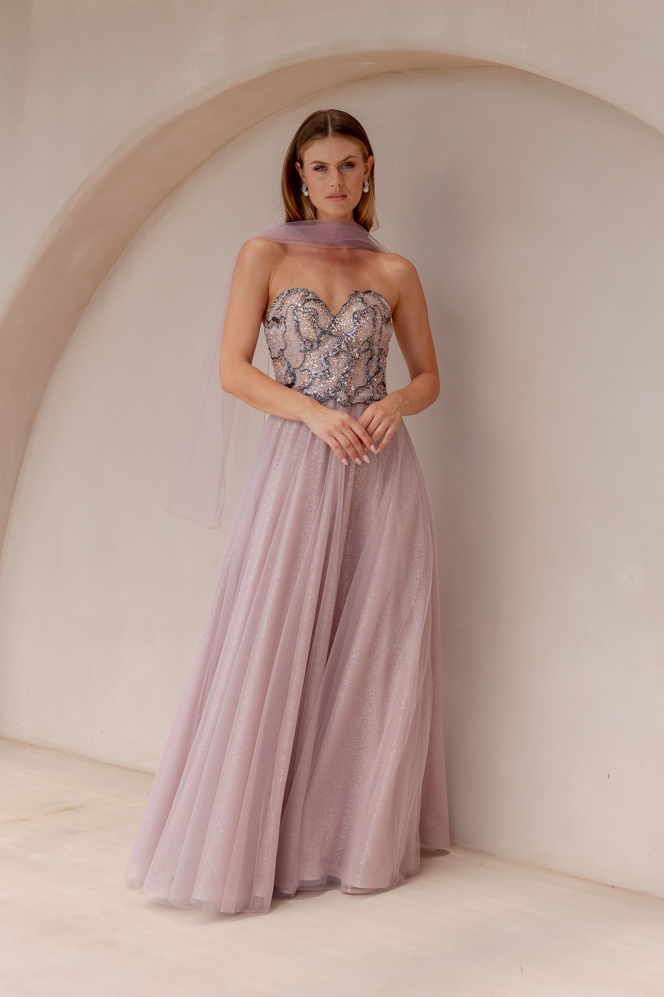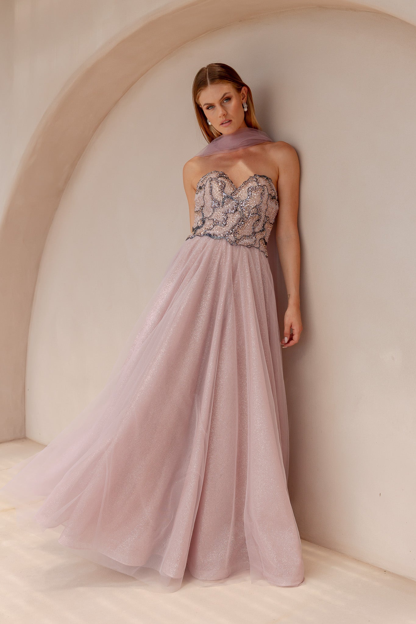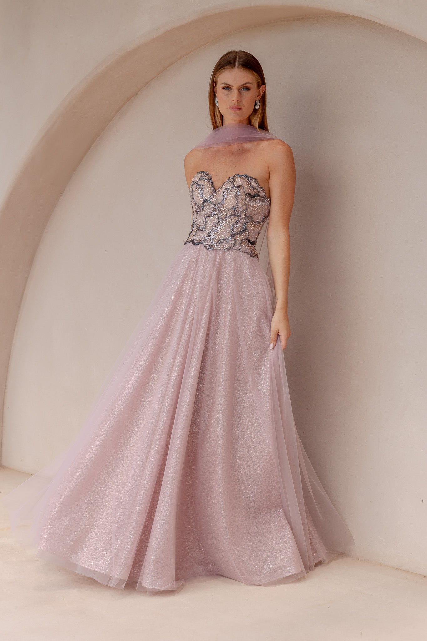 Turn heads in our dazzling Zarle Formal Dress, crafted from luxurious beaded tulle. The intricately beaded bodice adds a touch of glamour, while the voluminous A-line skirt in sparkling tulle creates a fairy tale silhouette. Complete with a delicate tulle scarf to drape elegantly around the neck and an invisible back zip for a seamless finish, this gown is perfect for formal events, evening occasions, or special celebrations.